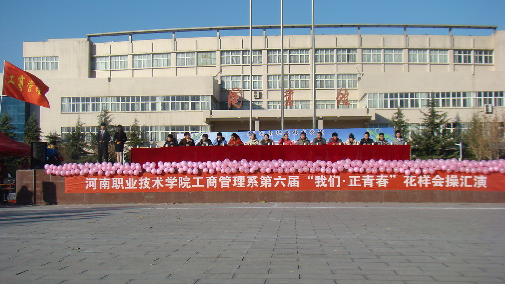2014年11月27日,在河南职业技术学院国旗台前,工商管理系纪检部举办第六届“我们正青春”花样会操活动,工商管理系大一新生积极参与比赛,此次活动提高全系早操质量,丰富大学生的课余生活,提高身体素质焕发同学精神风貌,锻炼强健体制,培养同学们团结协作的精神。获奖情况如下: