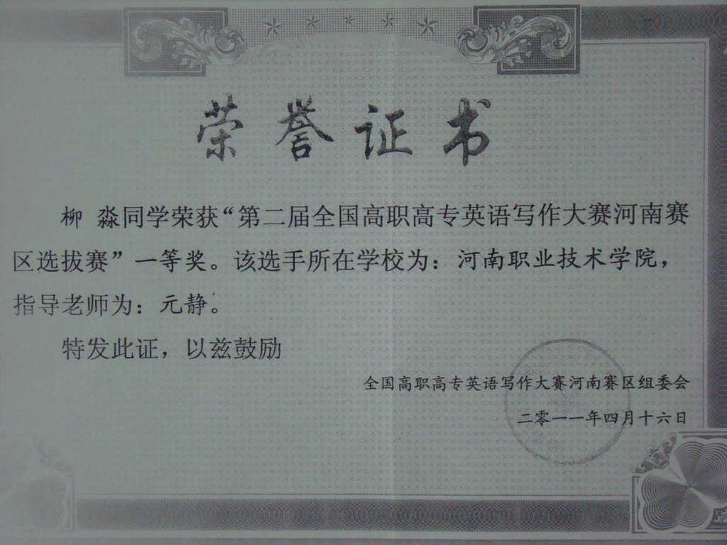 上一条:第二届全国高职高专英语写作大赛河南赛区选拔赛一等奖 下一条:温宗和老师获首届全国就业指导课教学大赛二等奖