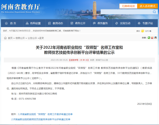 5月17日,河南省教育厅公布2022年河南省职业院校“双师型”名师工作室和教师技艺技能传承创新平台名单,我院窦雪霞教授主持的大数据与会计专业专业“双师型”名师工作室获批立项。这是财经管理学院是师资建设的重要成果。