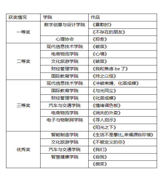 首届“心理微电影”评选活动的成功举办,是我校大学生心理健康教育工作的又一次尝试,进一步提高了学生们的心理健康意识,促进了彼此之间的交流与沟通。相信在未来的日子里,同学们能够将所学知识运用到实际生活中,不断成长和进步。