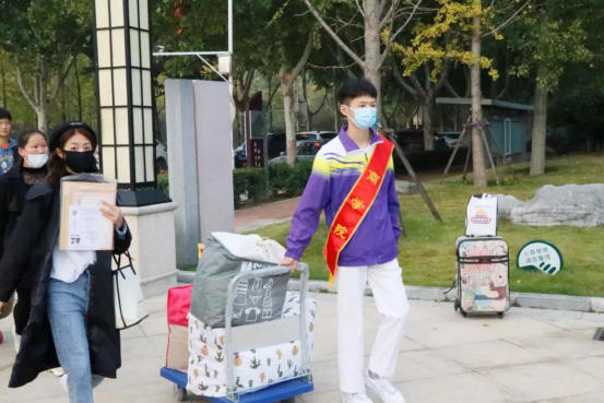 今年的迎新活动中,党员志愿者是一道格外亮丽的风景线。考虑到受疫情影响,新生家长无法入校的问题,学院“以生为本”,创新迎新志愿服务队服务形式,对志愿者进行编号登记,采用包干到人的方式,由志愿者与新生一对一对接,入校之前就建立联系,来校之后,从进入校门开始、到办理报到手续、寝室入住,再到领取生活用品,全程陪同,一站式服务,减少志愿者工作衔接带来的诸多不便和问题,让新生安心,家长放心。