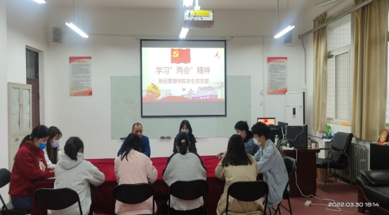为增强党支部的凝聚力,提高支部成员的党性修养,财经管理学院学生党支部于2022年3月30日在行政楼518开展学习“两会”精神主题活动。学生支部书记张文龙、组织委员辛馨及在校学生党员参加此次活动。