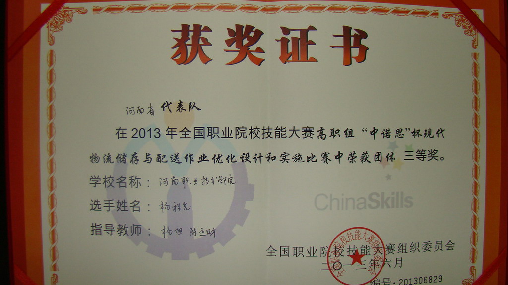 本次大赛由教育部主办,共有63支国内队和来8支国际队参赛。我院工商管理系物流管理专业的刘旋、郭川粮、黄珍娜和杨成光四位学生组成的代表队,在该专业老师陈运财和杨旭的带领下,赛前精心准备、认真演练、大胆创新,赛场上凭借娴熟的技能和良好的素质在方案制作、技能测评和实际操作等环节步步为营、稳扎稳打,最终取得团体三等奖的优秀成绩。这是我院学生在此赛项中取得的最好成绩,也是我省代表队在此赛项在上取得的唯一奖项。