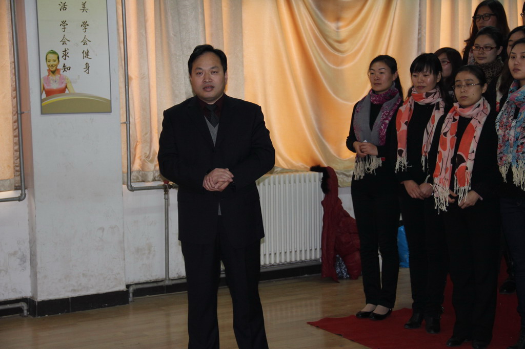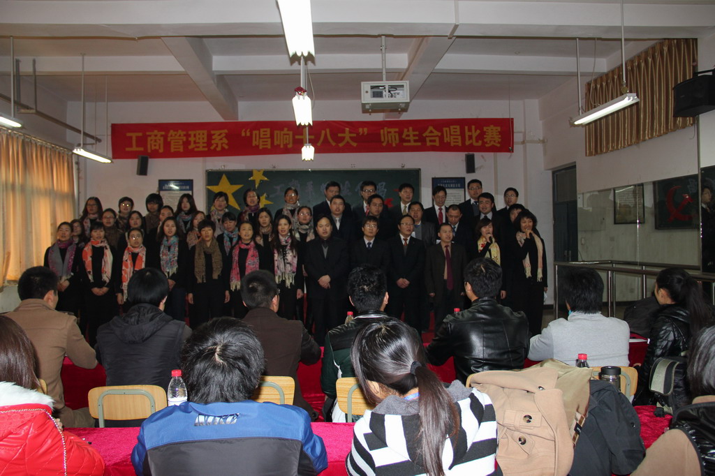 11月22日下午,由工商管理系党总支主办的“唱响十八大”师生红歌大合唱表演在商务礼仪实训室拉开帷幕。副院长占江亲临指导并参加了合唱表演。