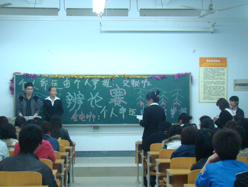 本届辩论赛本着“公平竞争,力争第一”的理念,成立活动领导工作小组,系副主任李湘勤带领团总支全体老师,亲自参与活动组织,紧紧围绕学生最关心的“学业、道德、情感”等方面进行选题命题。学生积极参与,表现出极大的热情,有条不紊地进行各个环节的比赛。在决赛现场,参赛选手机智、幽默的辩才,优雅的风度,深深地打动和感染了在场的每一位观众,得到了评委的一致好评。经过激烈的角逐,物流管理091班、会计电算化095班分别获得第一名和第二名,会计电算化093班和会计电算化094班分别荣获最佳组织奖和优秀团队奖。