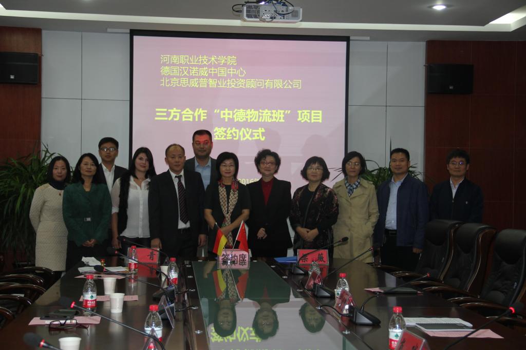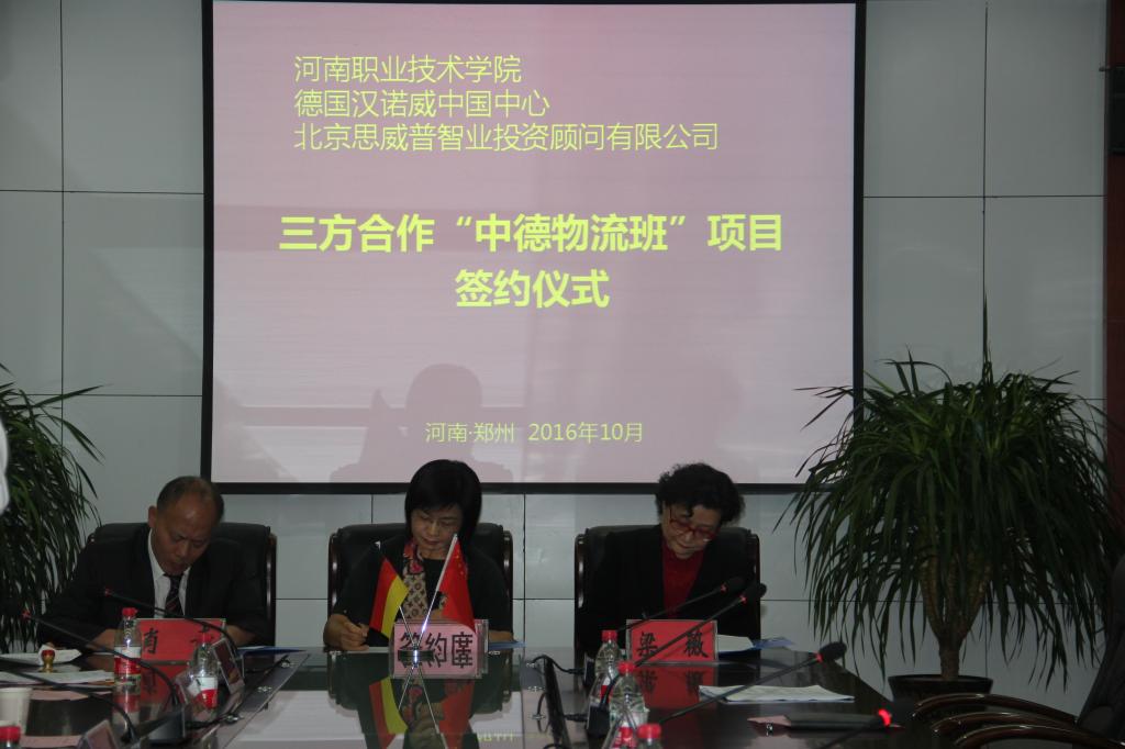 10月21日下午,我院与德国汉诺威中国中心和北京思威普智业投资顾问有限公司三方合作“中德物流班”项目签约仪式在行政楼303会议室隆重举行。出席签约仪式的学院领导有院长李桂贞、副院长肖珑、合作办学处副处长李小强及工商管理系相关领导。会议由肖珑副院长主持。