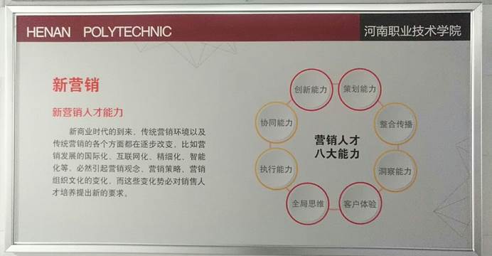 经过广泛调研和精心设计,育人基地文化长廊于近期建设完工,基地西大厅文化墙解读了“五新”内涵,大厅里建立了开架图书角,商学院募集近500本图书供师生阅读。基地长廊悬挂24块宣传板,展示了商业文化、专业知识、人才培养路径、励志名言等多方面的内容,图文并茂、生动形象。实训室内部制作了近百块挂图标牌,主要展示业务流程及专业核心知识要点。新商科实践育人基地优美的环境、现代化的实训设备、浓郁的文化氛围使师生耳目一新。