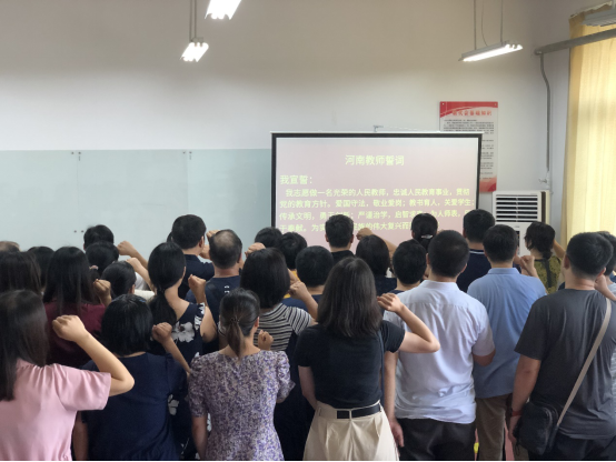 首先,商学院院长万久玲带领大家诵读河南教师誓词, 嘹亮的誓言铿锵有力,是每一位教师的自我期许,郑重地表达了教师这一神圣职业的自豪感和责任感。随后,李书记要求我院教职工认真学习《新时代高校教师职业行为十项准则》,以“时代楷模”李芳、张玉滚同志为榜样,用坚守和奉献在平凡的岗位上书写着出彩的人生,成为学生健康成长的指导者和引路人,展现新时代“四有”教师的模范形象。