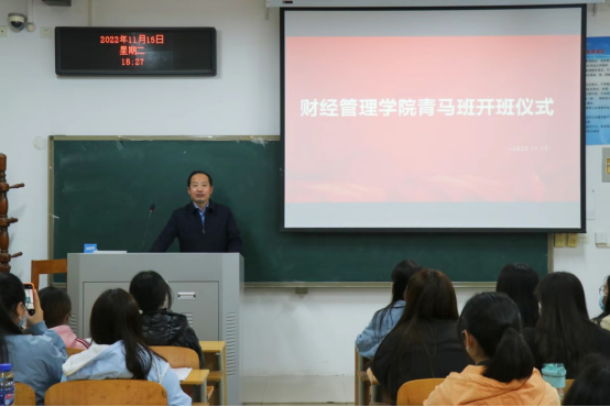 为加强对青年大学生的思想政治引领,以实际行动践行党的二十大精神,2022年11月15日,财经管理学院在教学楼2103教室举行了2022-2023学年第一期青马班开班仪式,仪式由学院团总支书记张文龙主持,学院党总支副书记余湾出席,青马班30名学生参加了开班仪式。