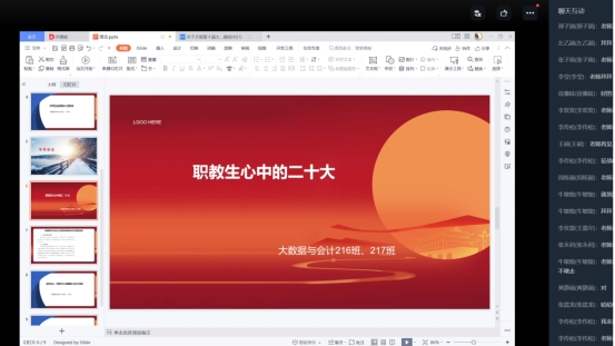 财经管理学院辅导员通过线上、线下等方式,组织广大学生结合“职教生心中的二十大”这一主题,围绕党的二十大报告提出的2035年发展目标和对青年人的寄语,将党的二十大精神融入立德树人全过程,坚持德技并修、知行合一,教育引导学生衷心拥护党的领导和我国社会主义制度,把小我融入大我、融入中华民族伟大复兴之中。班会上,同学们踊跃发言讨论,谈理想、谈学习、谈体会,并表示要不断加强专业知识技能学习,夯实自身综合素养,让青春在全面建设社会主义现代化国家新征程上绽放绚丽之花,用实际行动践行“请党放心、强国有我”的铮铮誓言。