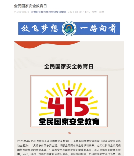 为进一步增强学生维护国家安全的意识,树立总体国家安全观,进一步推动总体国家安全观深入人心、落地生根,引导学生挺膺担当时代新人共筑国家安全防线,在全国第8个“全民国家安全教育日”到来之际,根据学校相关工作部署,财经管理学院开展了形式多样的国家安全教育日主题活动。
