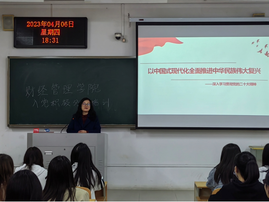 为进一步加强入党积极分子对党的基本理论的系统学习,提高入党积极分子的理论水平,确保新党员的发展质量,4月3日至18日,财经管理学院举办了2023年上半年入党积极分子培训班。经过群团推优,组织考察,共有69名入党积极分子参加了培训。财经管理学院党总支书记吴玉刚、副书记余湾、马克思主义学院副院长胡海涵、学生支部书记张文龙参与了培训班的授课。