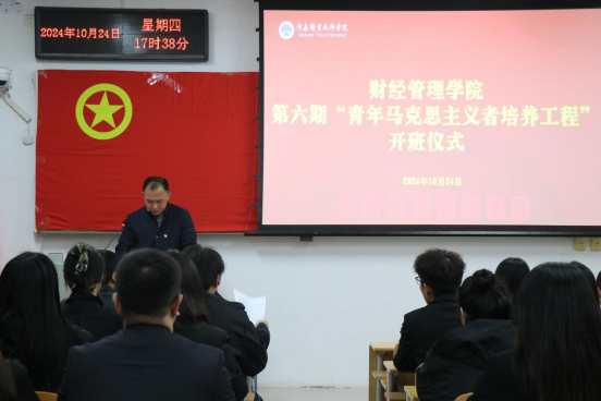 为深入学习贯彻习近平新时代中国特色社会主义思想和党的二十届三中全会精神,着力为党培养和输送青年政治骨干,塑造一批素质高、能力强、肯实干的团学干队伍,10月24日,财经管理学院在2105教室举行第六期“青年马克思主义者培养工程”培养班开班仪式暨开班第一课。学院党总支书记马金伟、副书记余湾、团总支书记张文龙、专职辅导员及30名青马学员参加了开班仪式。本次开班仪式由张文龙主持。