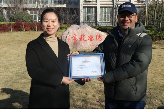 在热烈的掌声中,田华和姬晓锋共同为文化石揭幕。招生就业处副处长张静雯代表学校为校友颁发了捐赠证书。