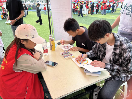 活动现场色彩斑斓,充满温馨治愈的氛围。彩虹能量卡区域成为热门打卡点,同学们纷纷驻足,抽取专属自己的彩虹能量卡。卡片上印着积极向上的话语和绚丽的彩虹图案,每一句鼓励都如同一束光,为大家注入满满的能量与勇气。彩绘曼陀罗区域则为学生们提供了一个自由表达内心情感的创意空间。同学们围坐在一起,手持画笔,在曼陀罗图案上尽情挥洒色彩。