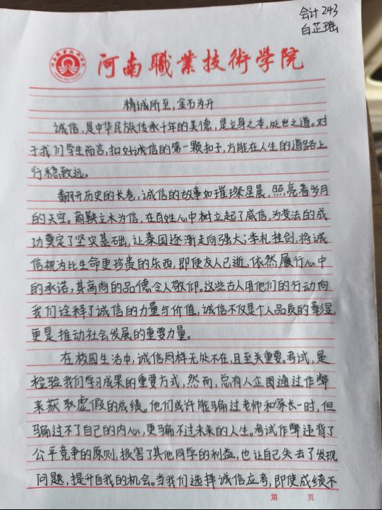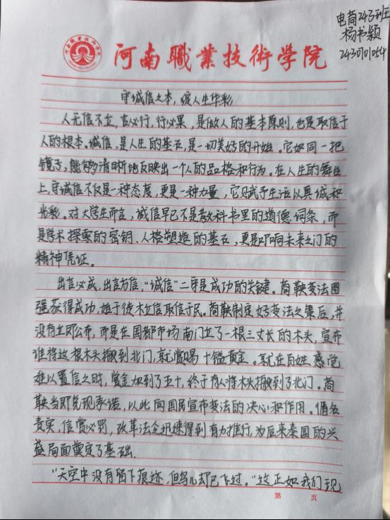 为进一步加强校园诚信文化建设,引导学生树立正确的诚信观念,营造诚实守信的良好氛围,红挑ht92vip于6月4日—10日圆满举办了以“诚信”为主题的征文活动。此次活动面向学院全体学生,得到了同学们的积极响应和广泛参与。