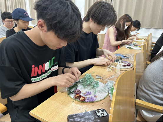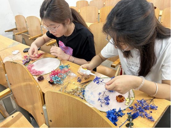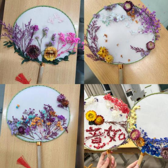 活动现场,五彩斑斓的干花、素雅的团扇整齐摆放。在老师的指导下,同学们纷纷拿起工具,发挥创意,将干花巧妙地粘贴在团扇上。每一把团扇都成为同学们内心世界的独特表达,承载着他们的梦想与情感。在制作过程中,同学们相互交流、分享创意,欢声笑语回荡在活动现场。原本陌生的同学因共同的兴趣爱好拉近了距离,增进了彼此的了解与友谊。