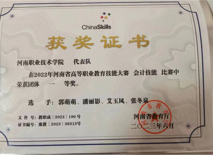 财经管理学院在2022年河南省高等职业教育技能大赛会计技能比赛中荣获团体一等奖选手:郭萌萌、潘丽影、艾玉风、张冬泉